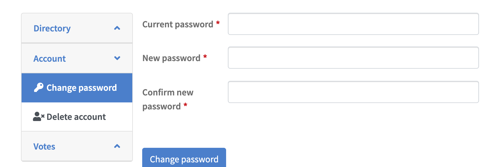 The new “Account” panel lets users change their WordPress user account password and also delete their account from within the frontend directory dashboard page.