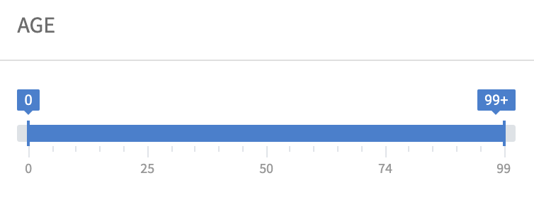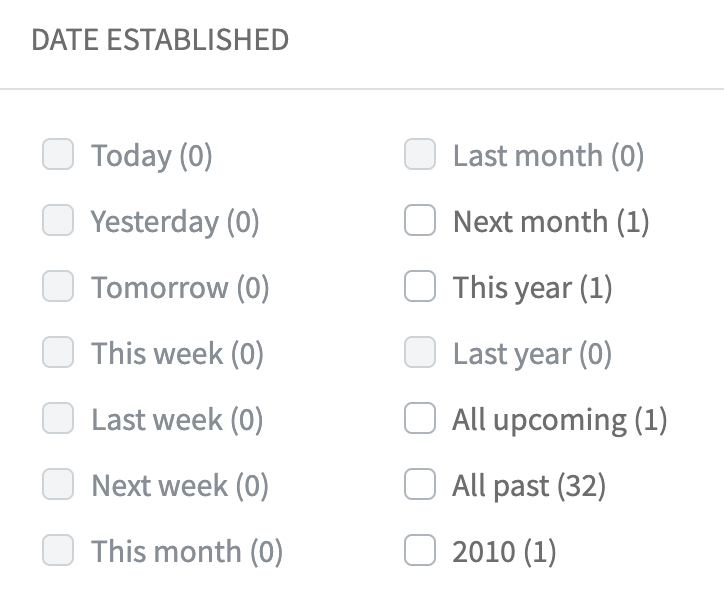 The “Date Range List” filter lets you define a list of date ranges and let users filter content items by one or more date ranges. Similarly the “Age Range”