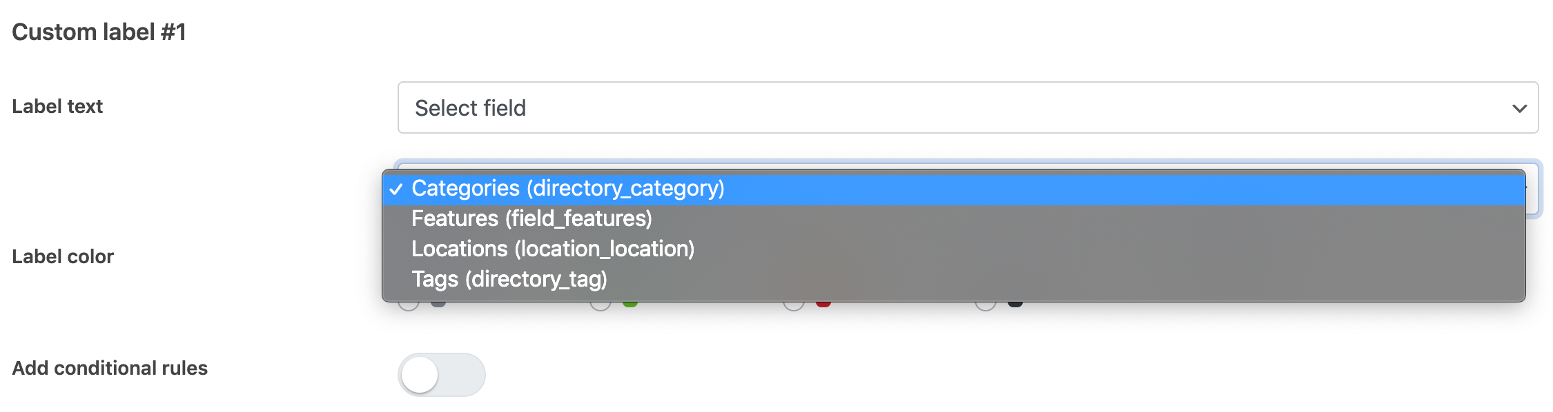 It is also now possible to use other field values dynamically as the label text, for example showing categories assigned to each listing as labels.
