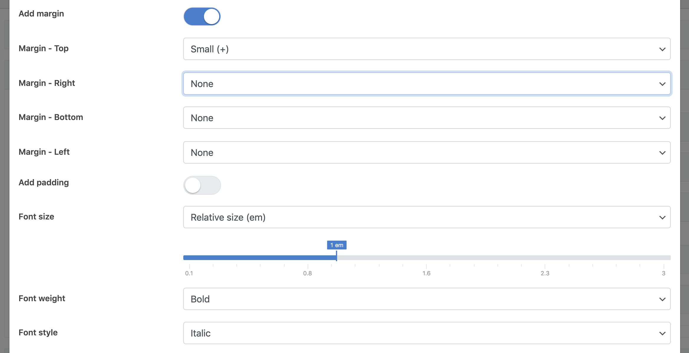 Configure padding, margin, font size and styles of each display element without entering any CSS.