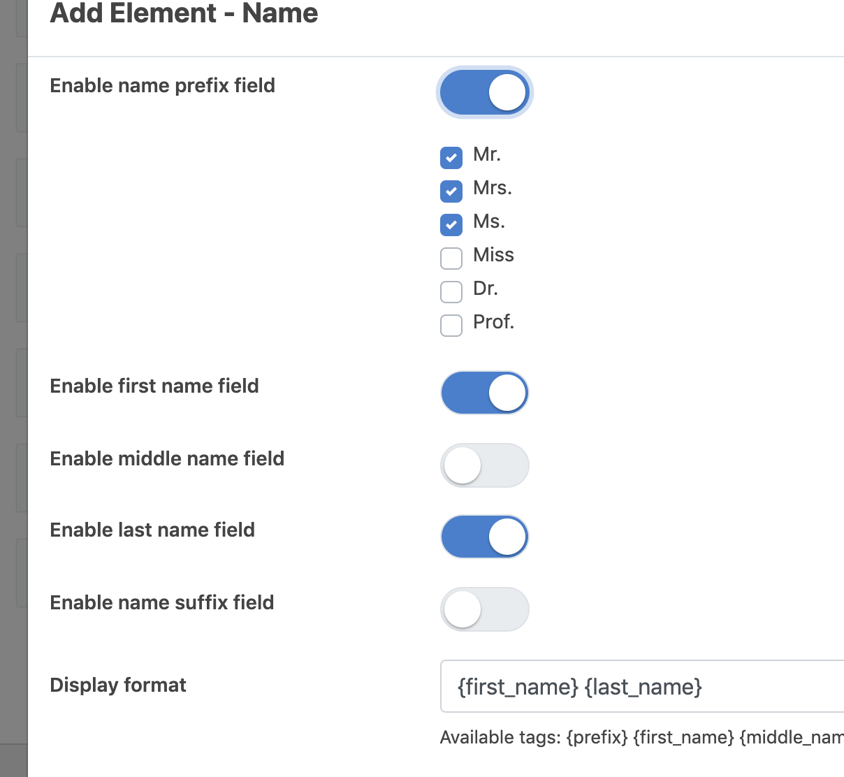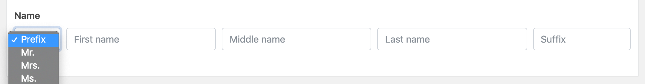 The new “Name” type field lets you enter first/middle/last names as well as name prefix (title) and suffix.