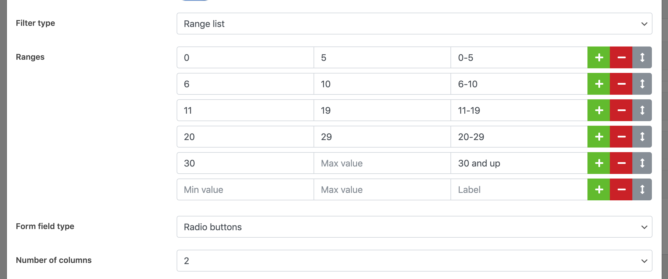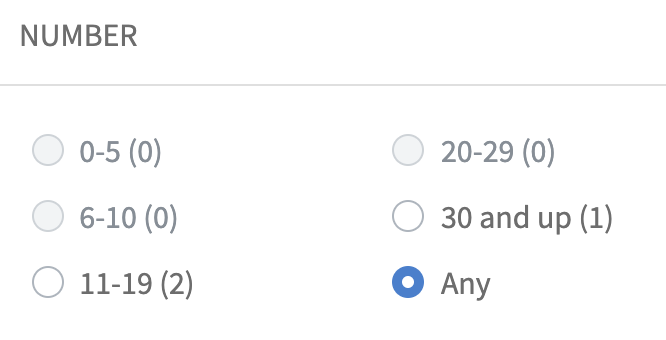 The “Range List” filter lets you define a list of number ranges and let users filter content items by one or more number ranges.