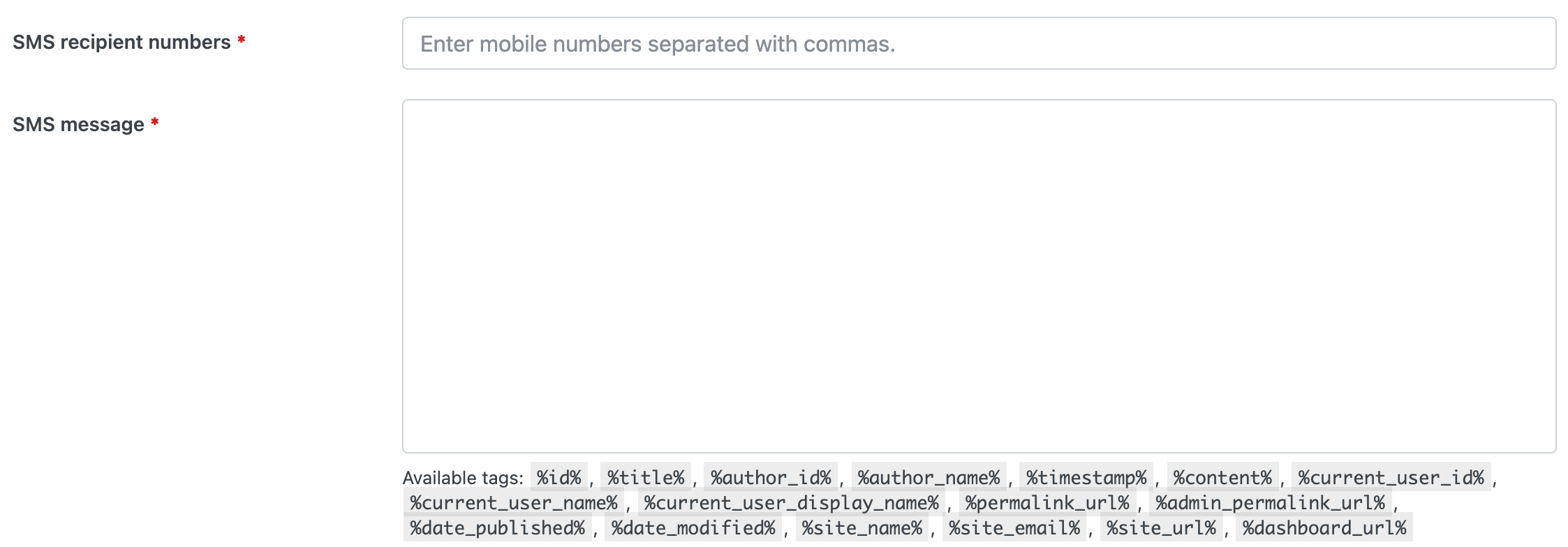 - SMS recipient numbers - Enter mobile numbers separated by commas.